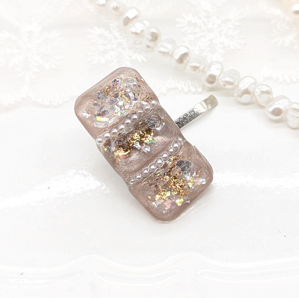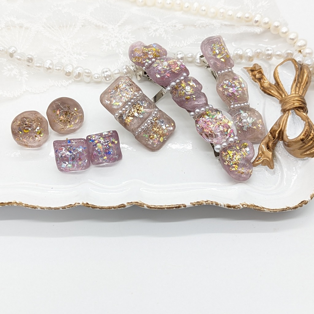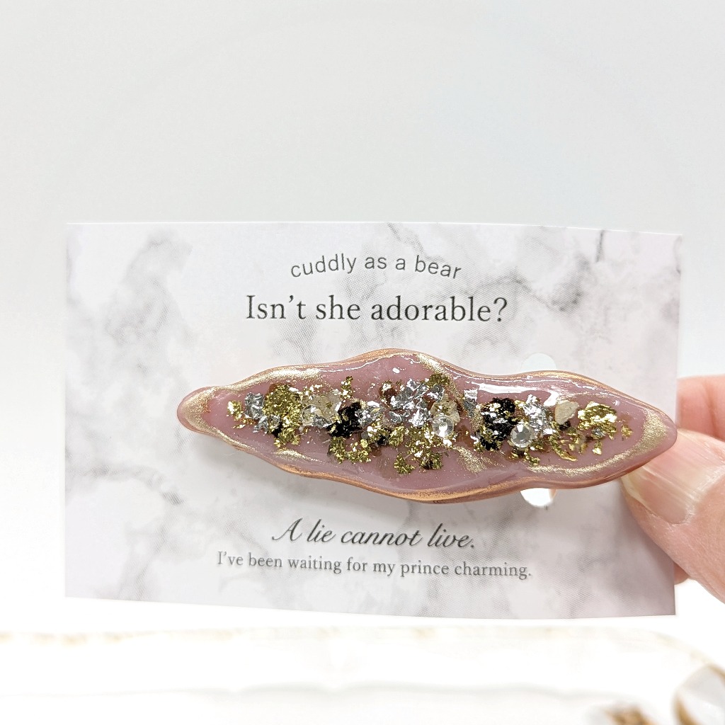 LINEショップ”Buychat”に新しくアクセサリーを出品しました!くすみ系のピンクのヘアピンとなります。シェル、ラメ、金箔、ホログラムをふんだんに使って作ったヘアピンとなります。今の時期にピッタリなヘアアクセサリーとなります。
