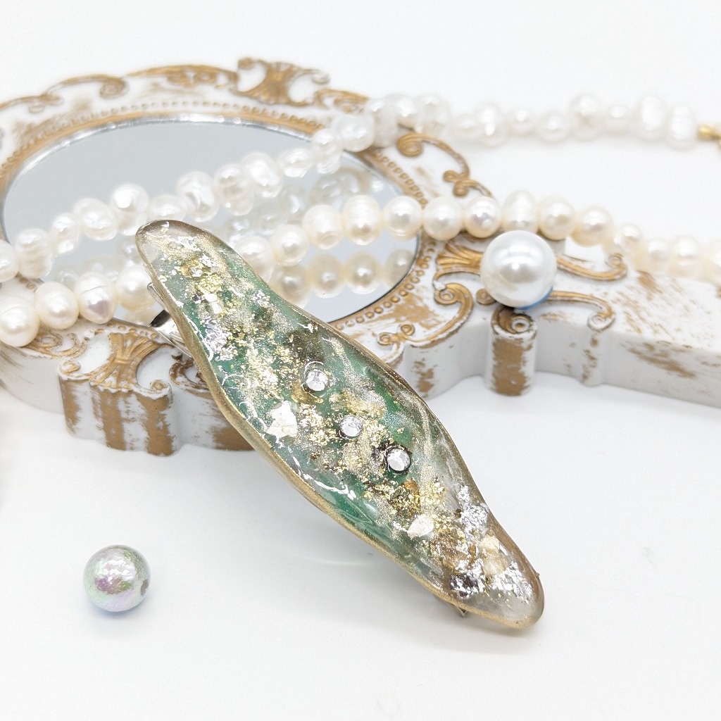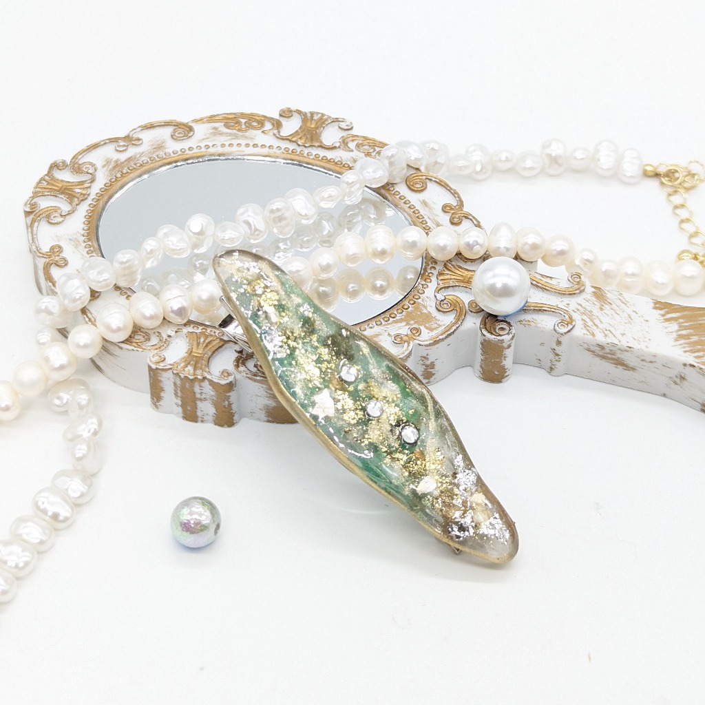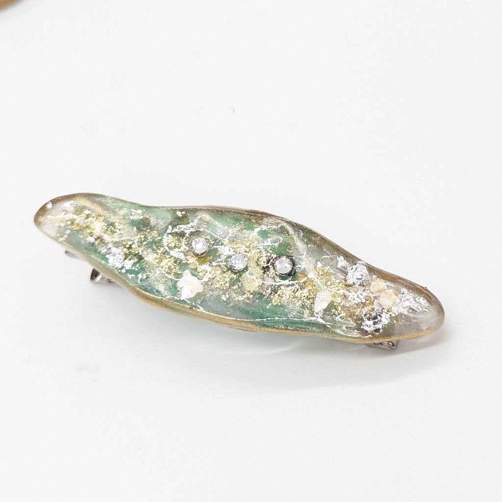 春を意識して作ったヘアピンとなります。淡いグリーンと金箔、ラメ、シェルをふんだんに使って作りました!