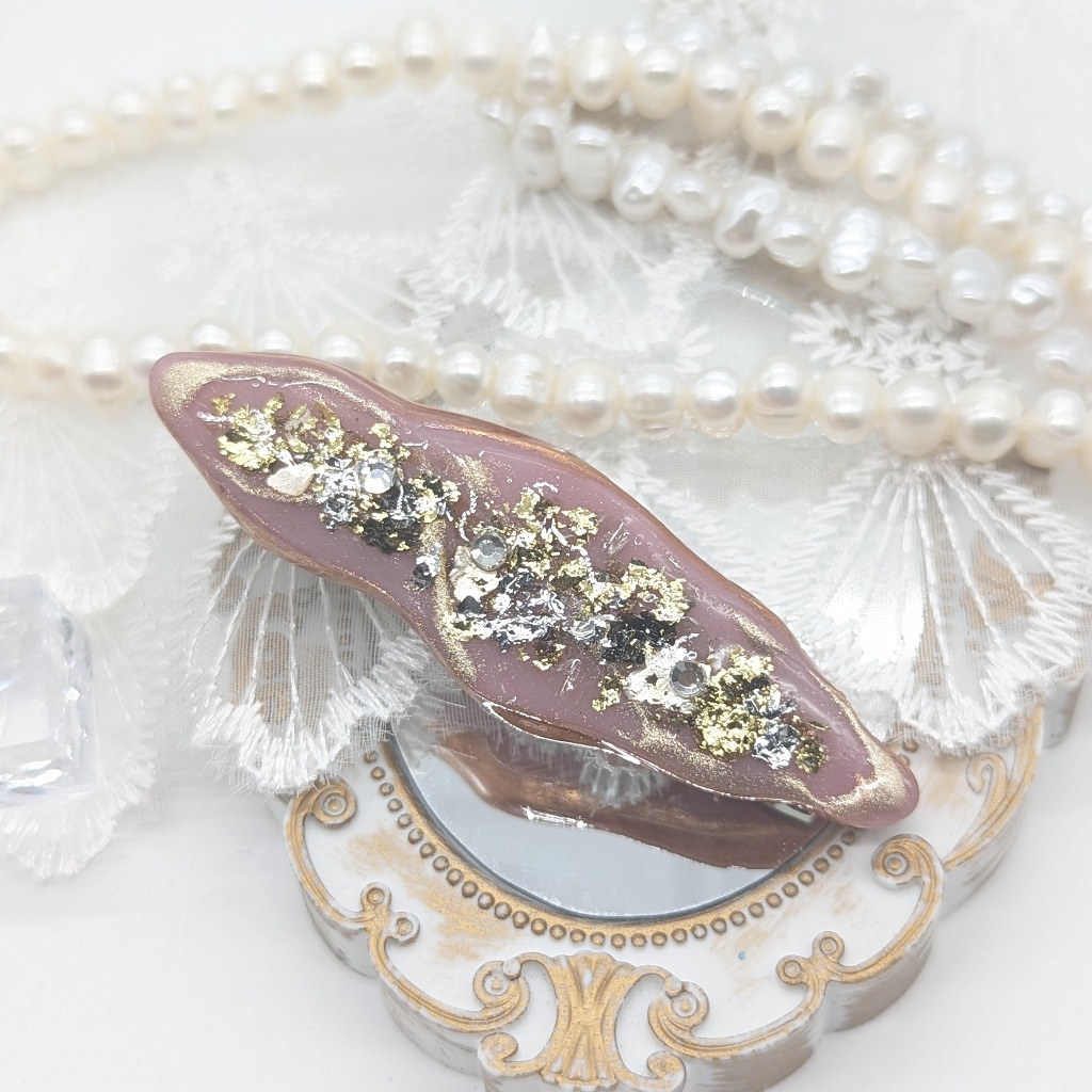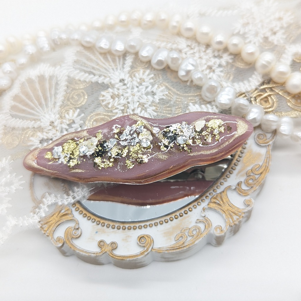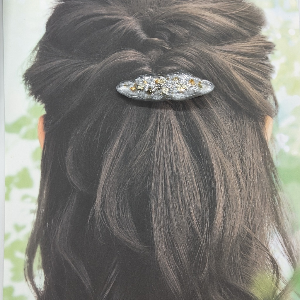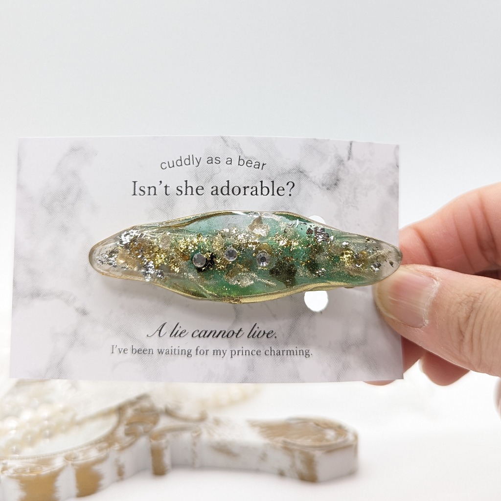 春を意識して作ったヘアピンとなります。淡いグリーンと金箔、ラメ、シェルをふんだんに使って作りました!