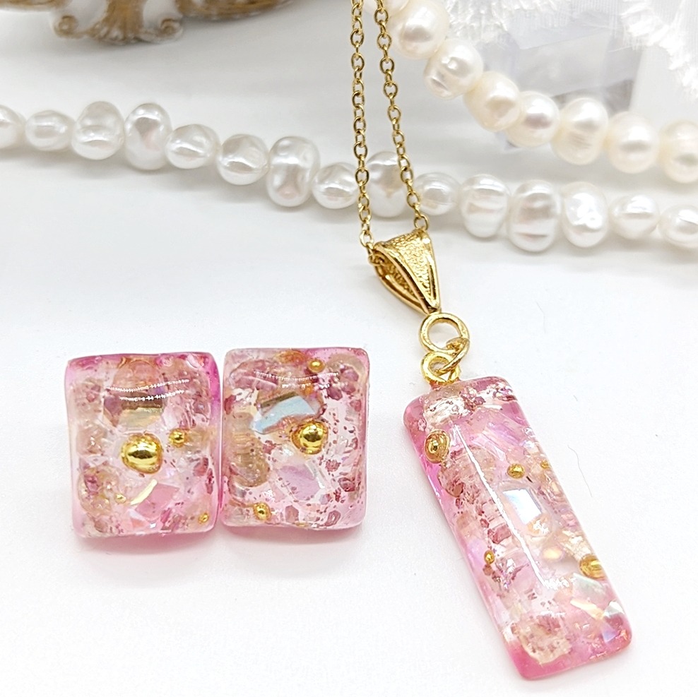 ”minne”に新しいアクセサリーを出品しました!可愛らしいピンクの鉱石風のピアスとネックレスのセットととなっております。普段使いはもちろんの事。プレゼントにギフトにもオススメです。デザインもシンプルでカジュアルの装いからフォーマルまでお使い頂けます。