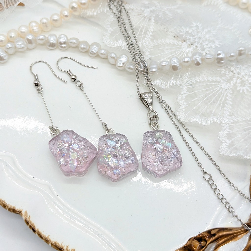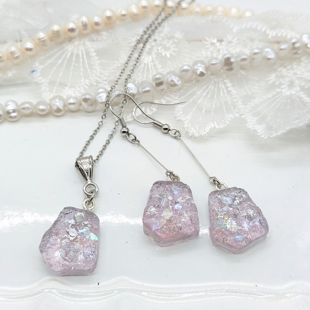 淡いパープルの天然石風のアクセサリーセットとなります。