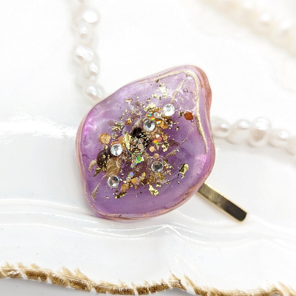 ”creema”に新しくアクセサリーを出品しました。天然石風に仕上げたポニーフックとなります。鮮やかなパープルのポニーフック!シェル、ラメ、ホログラムを散りばめて作りました。