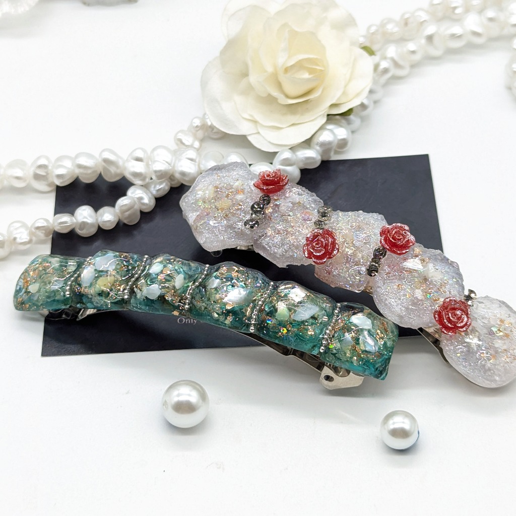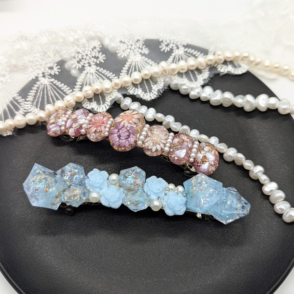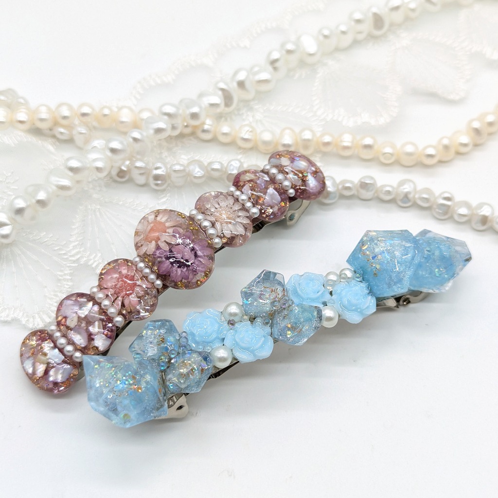 ”minne”に新しくアクセサリーを出品しました。バレッタ2点となります。ドライフラワーを使ったバレッタと、鉱石と薔薇のパーツを使って作ったバレッタとなります。オシャレで可愛らしい感じに仕上がりました!