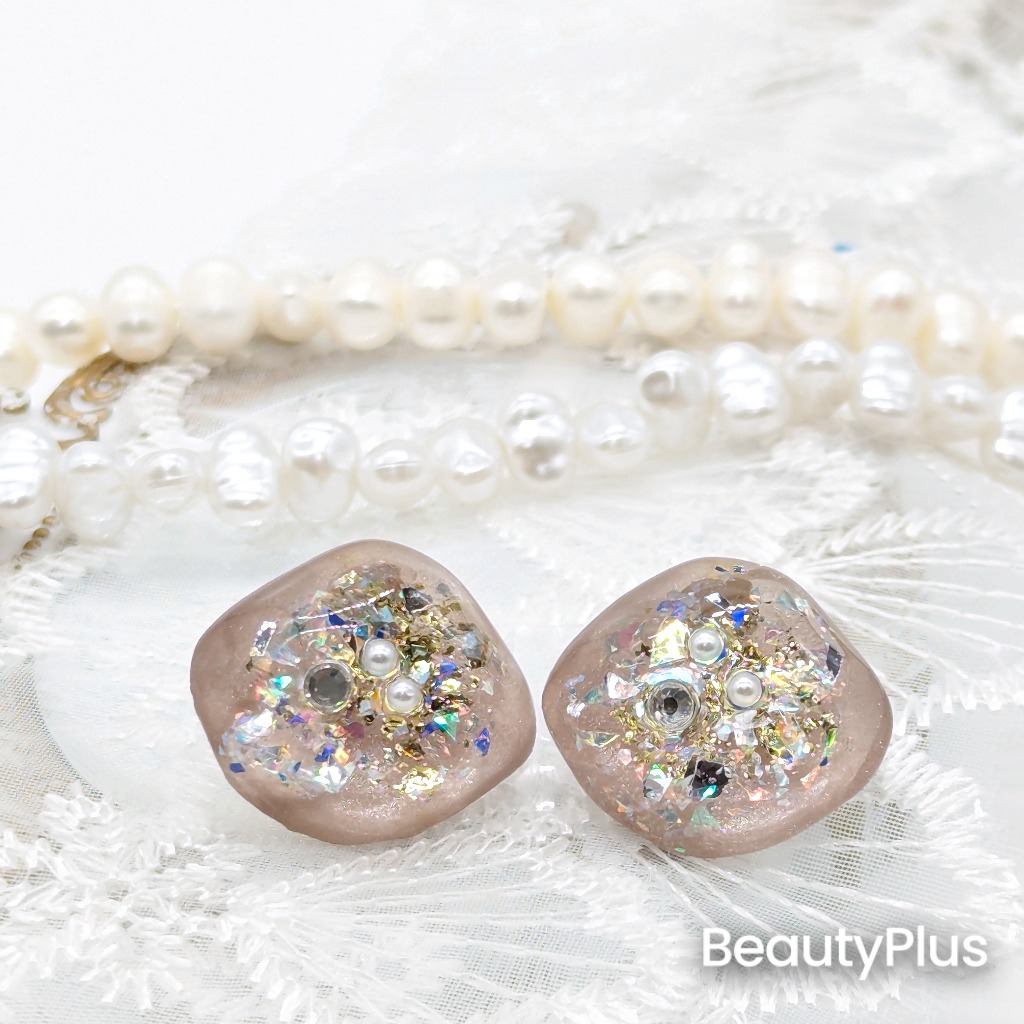 minneに新しくアクセサリーを出品しました。ジェルネイルを使って、レジンの中にホログラムや金箔など閉じ込めて作ったピアスとなります。