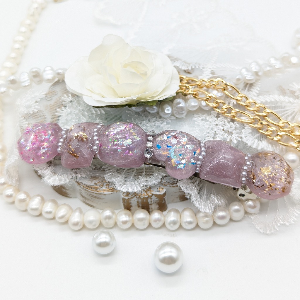 くすみカラーのパープルのバレッタで、派手な感じでもなく、シックな感じのデザインに仕上がりました!