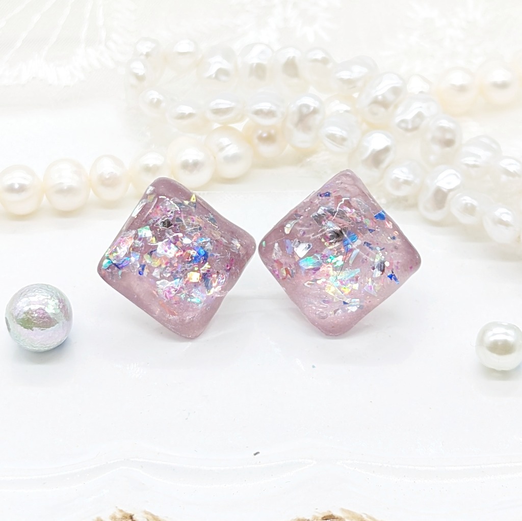 minneに新しいアクセサリーを出品しました。淡いパープルのスクエ型のピアスとなります。